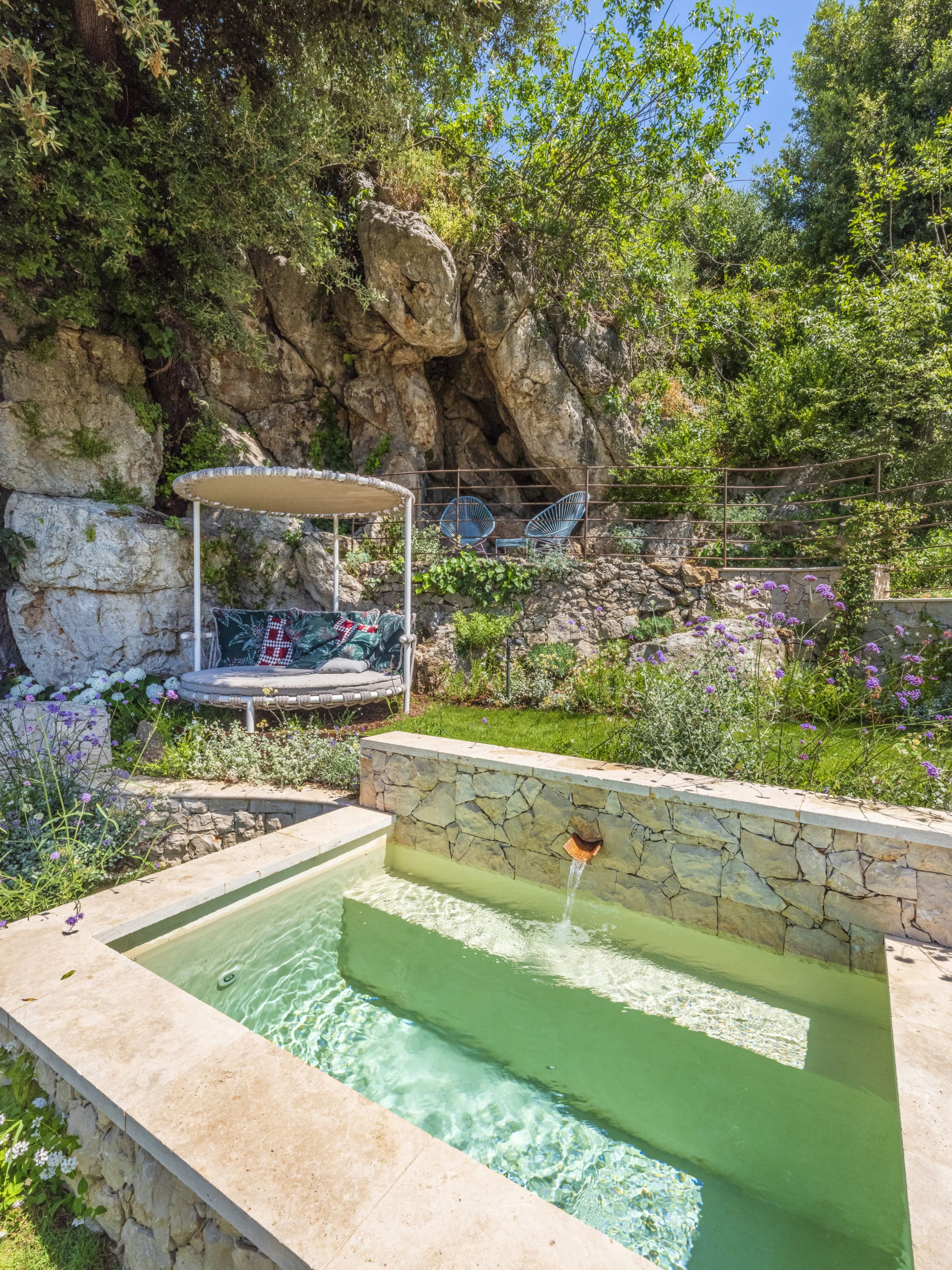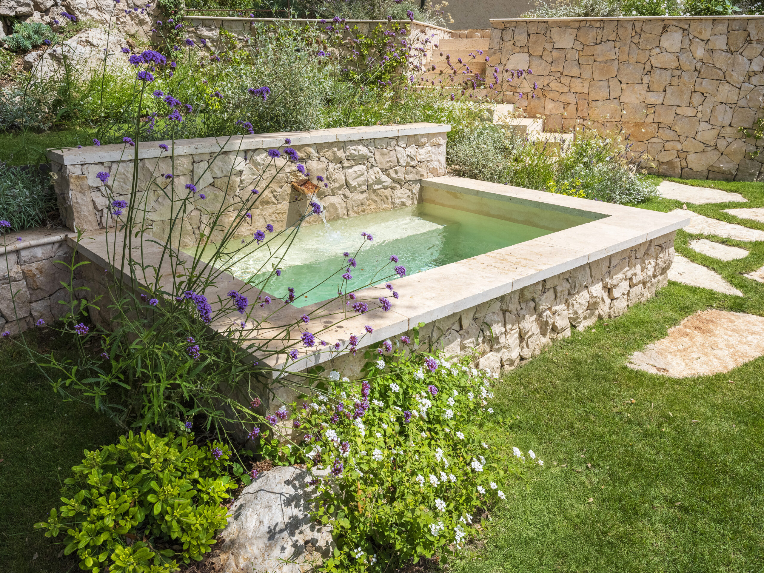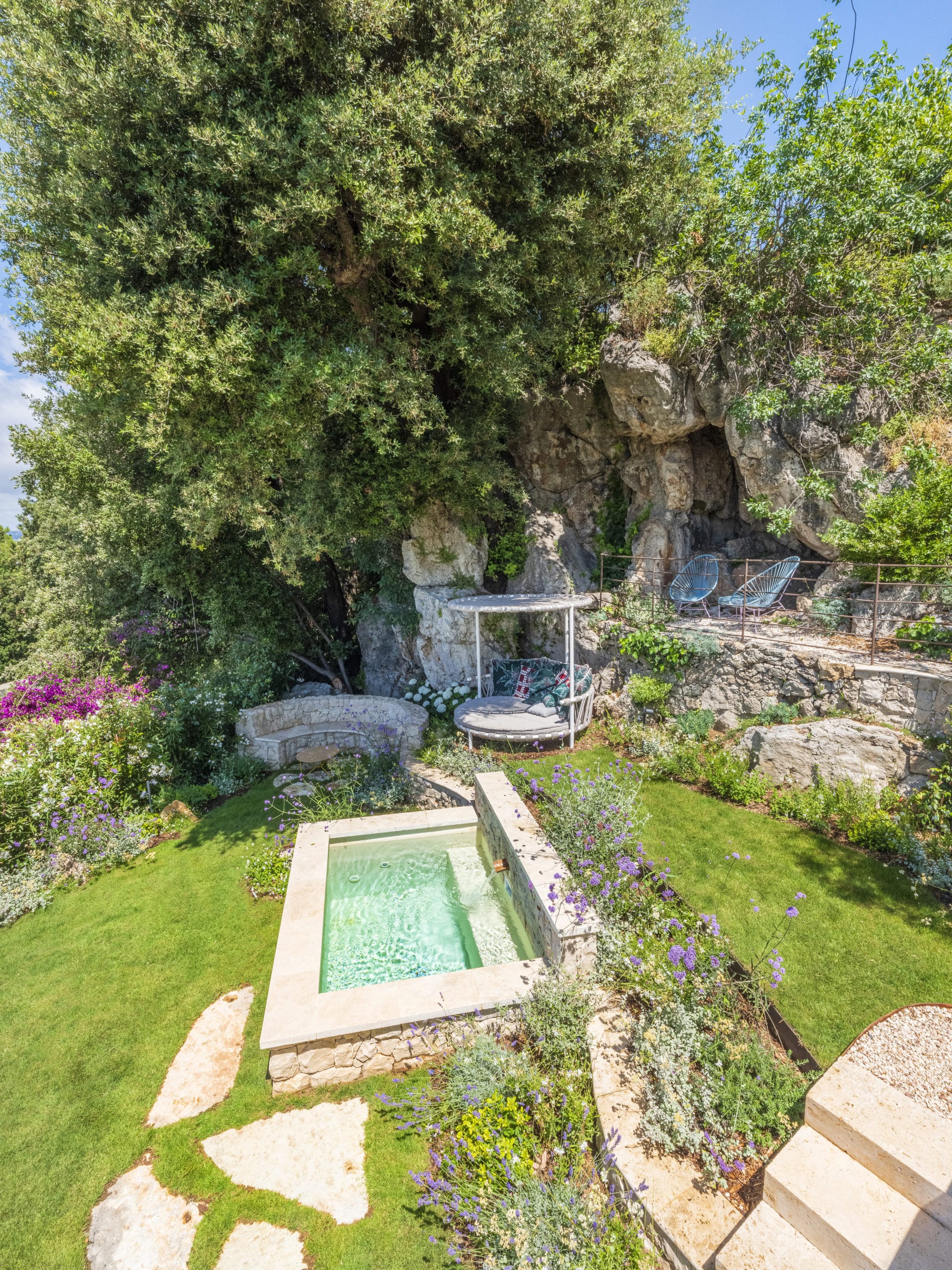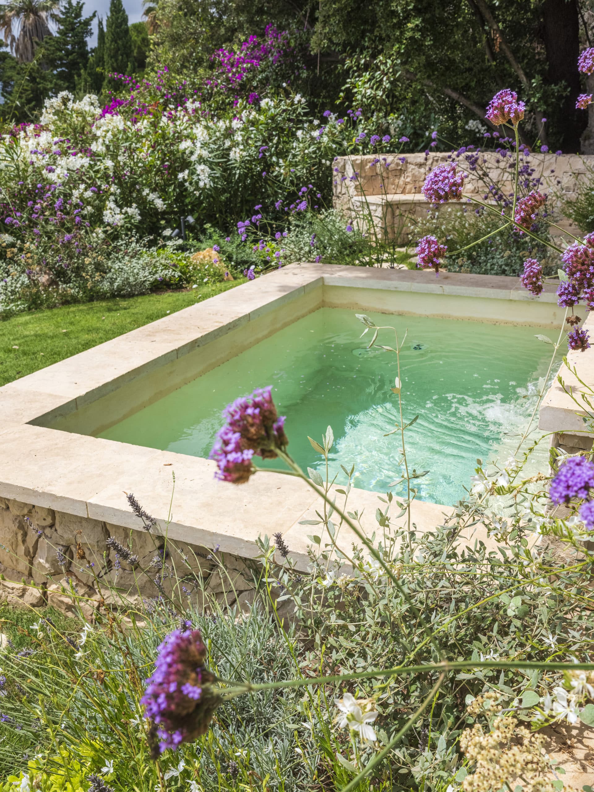 This landscape project aimed to restore interest to an unused section of the garden by revealing its full potential through the creation of a semi-sunken stone pool, complemented by stone walls and Mediterranean plants. Our intention was to enhance the site’s historic and authentic character.