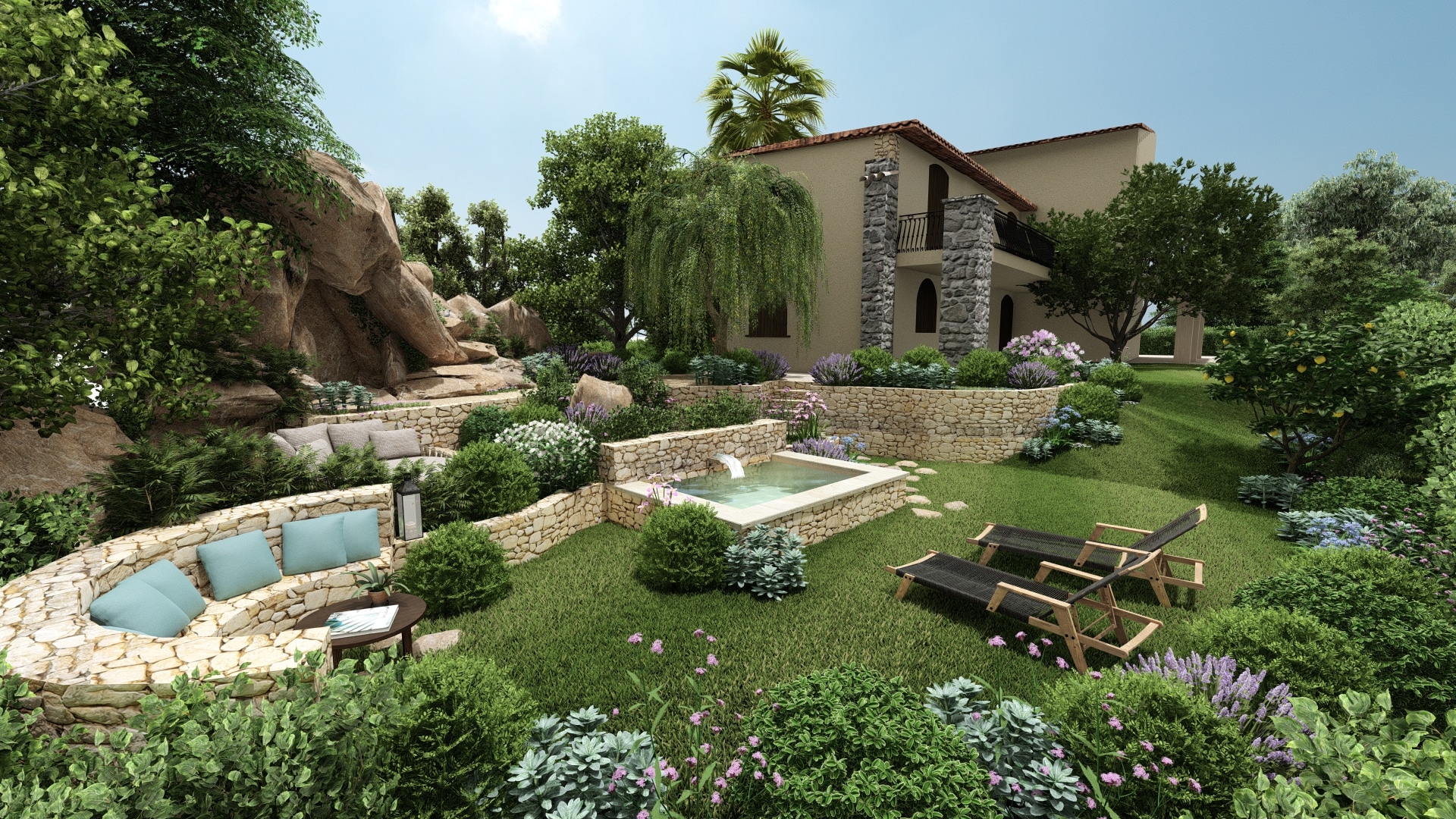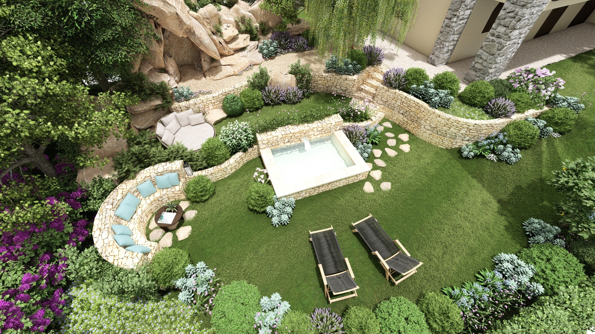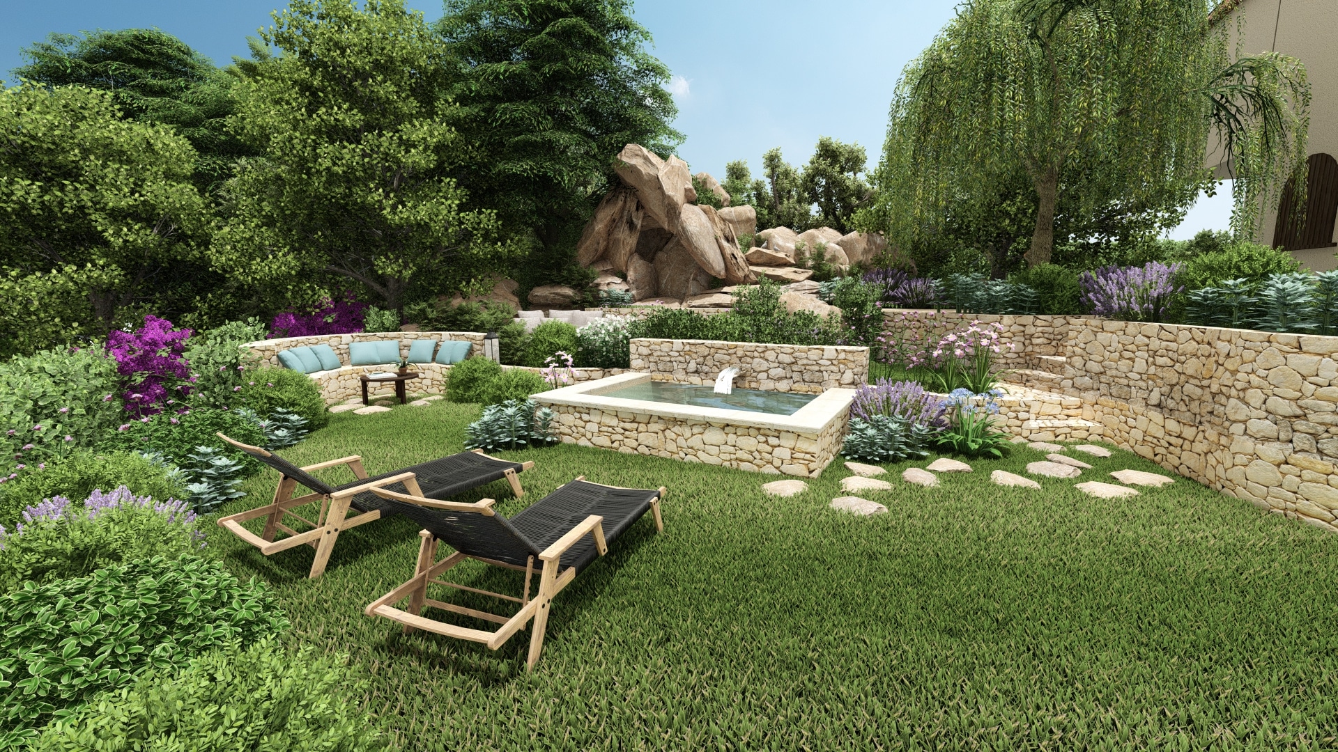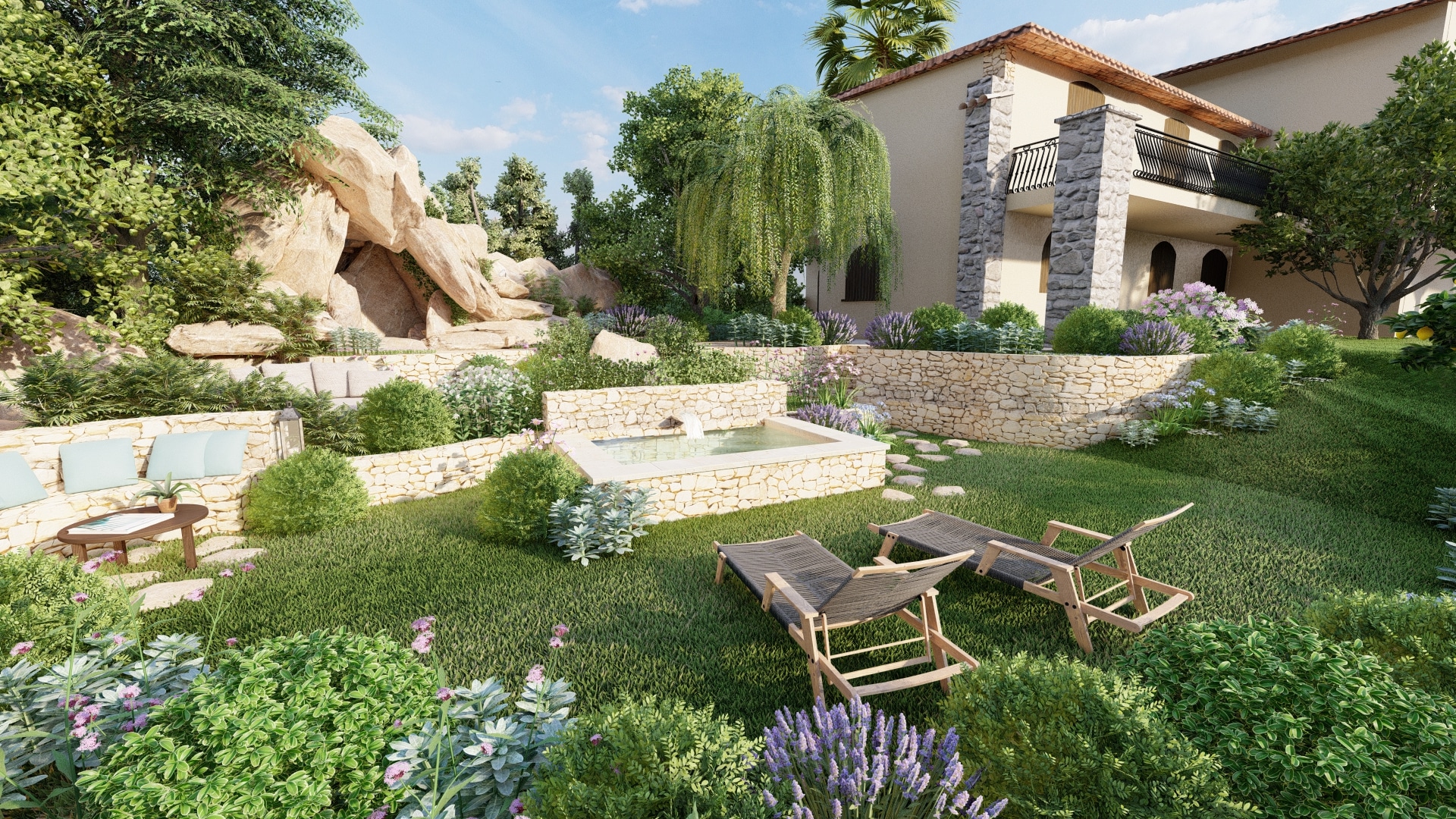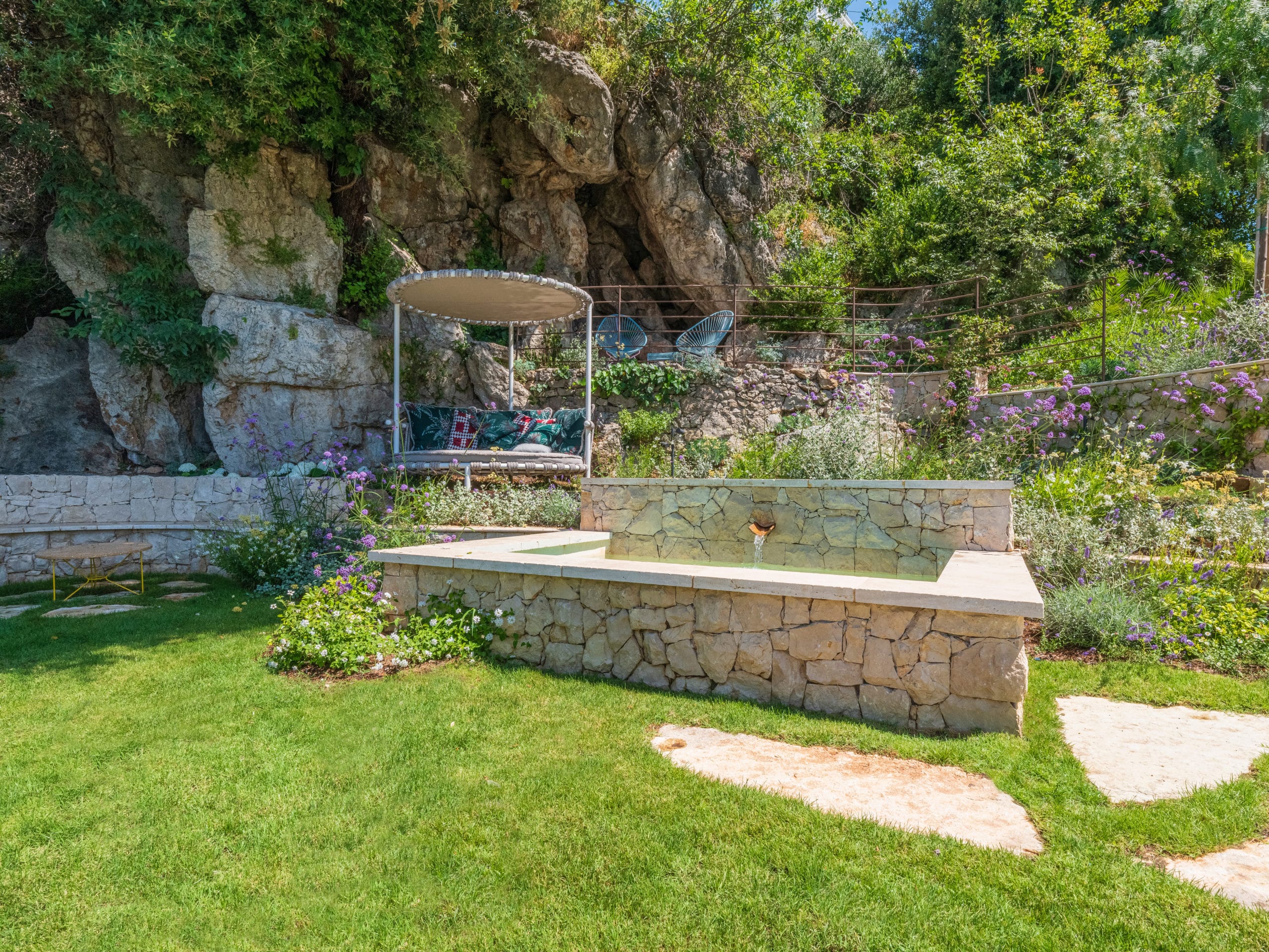 This landscape project aimed to restore interest to an unused section of the garden by revealing its full potential through the creation of a semi-sunken stone pool, complemented by stone walls and Mediterranean plants. Our intention was to enhance the site’s historic and authentic character.