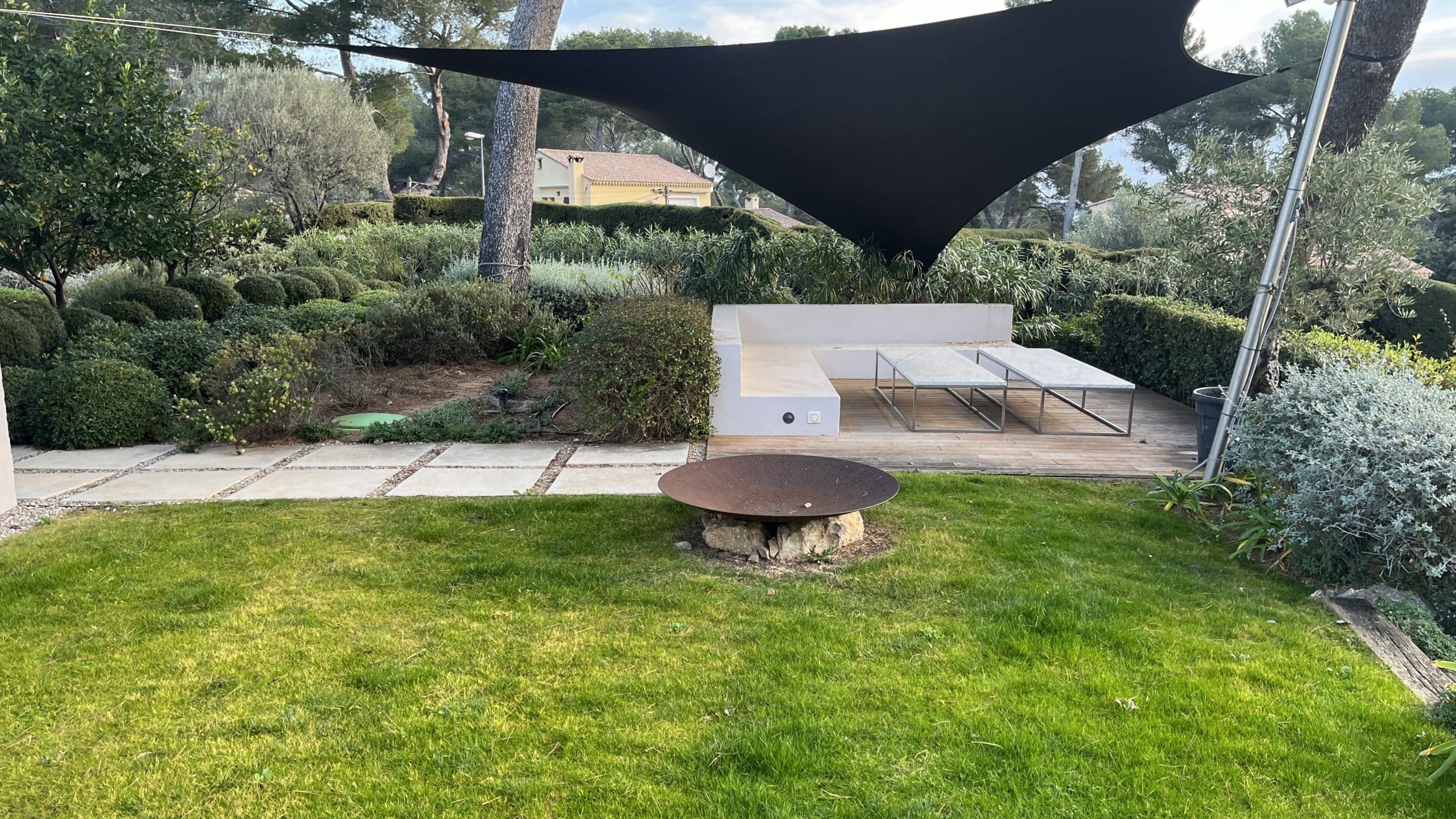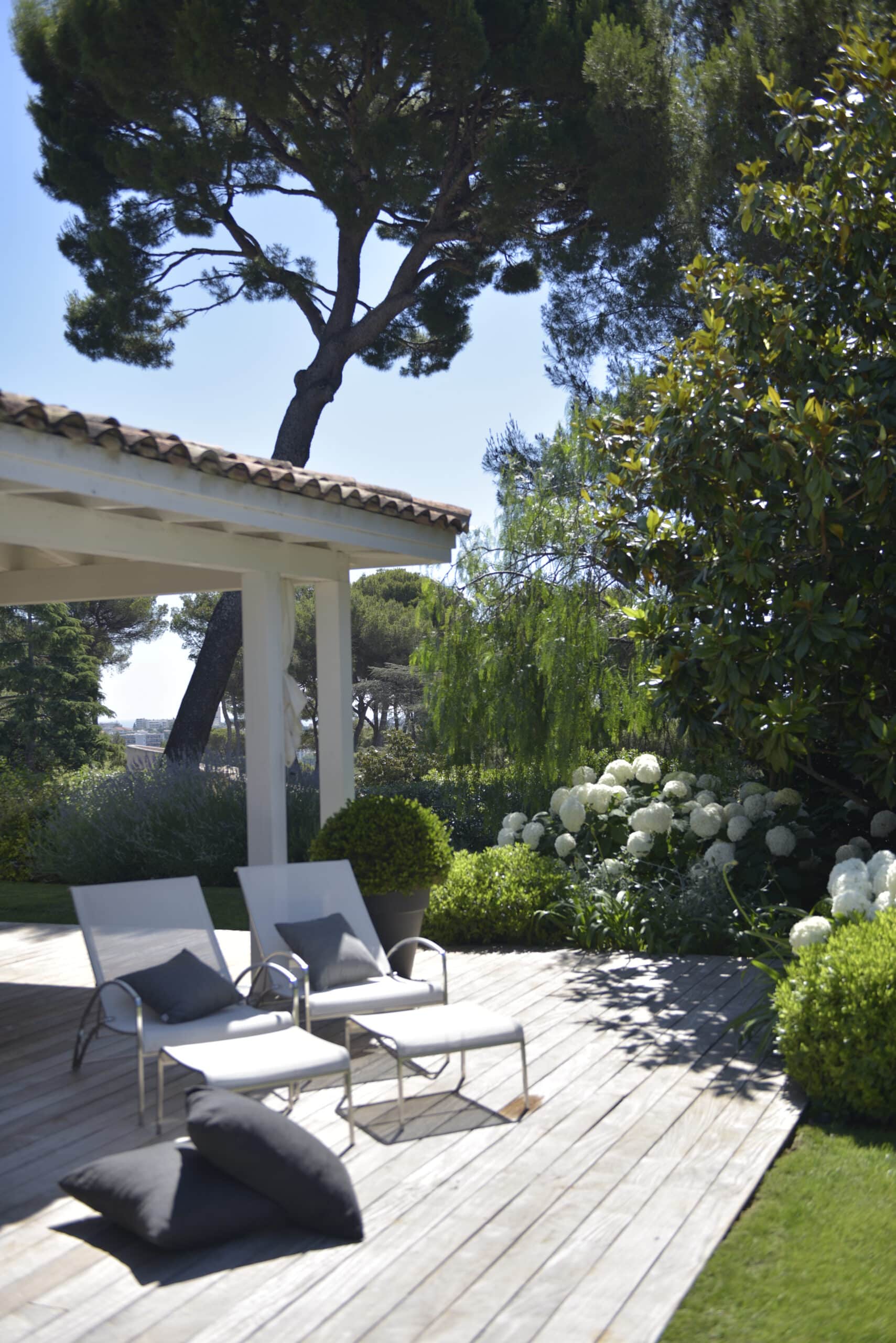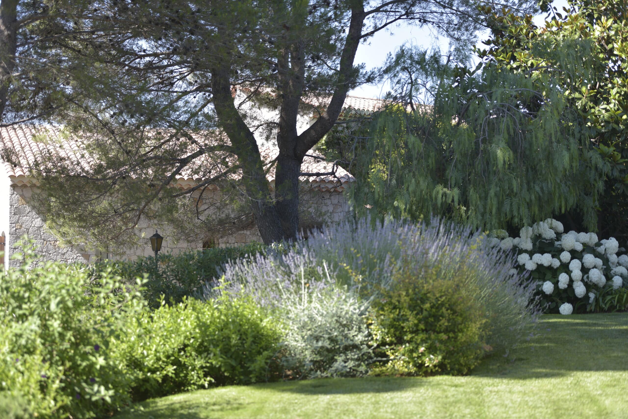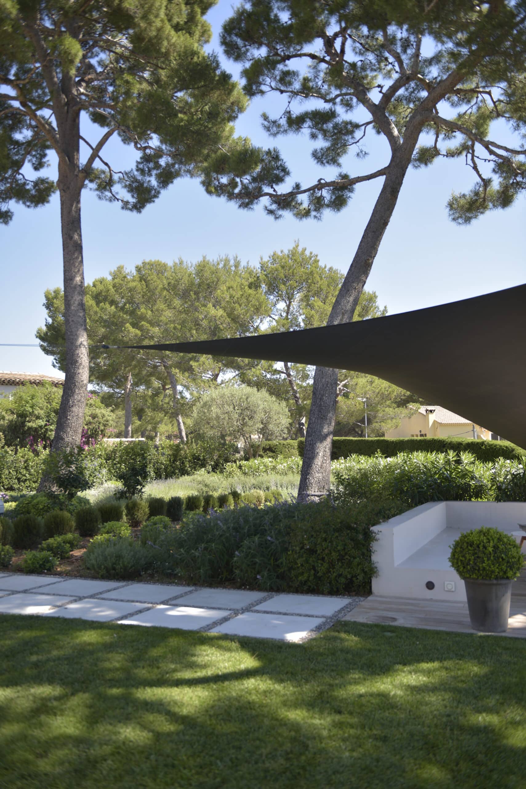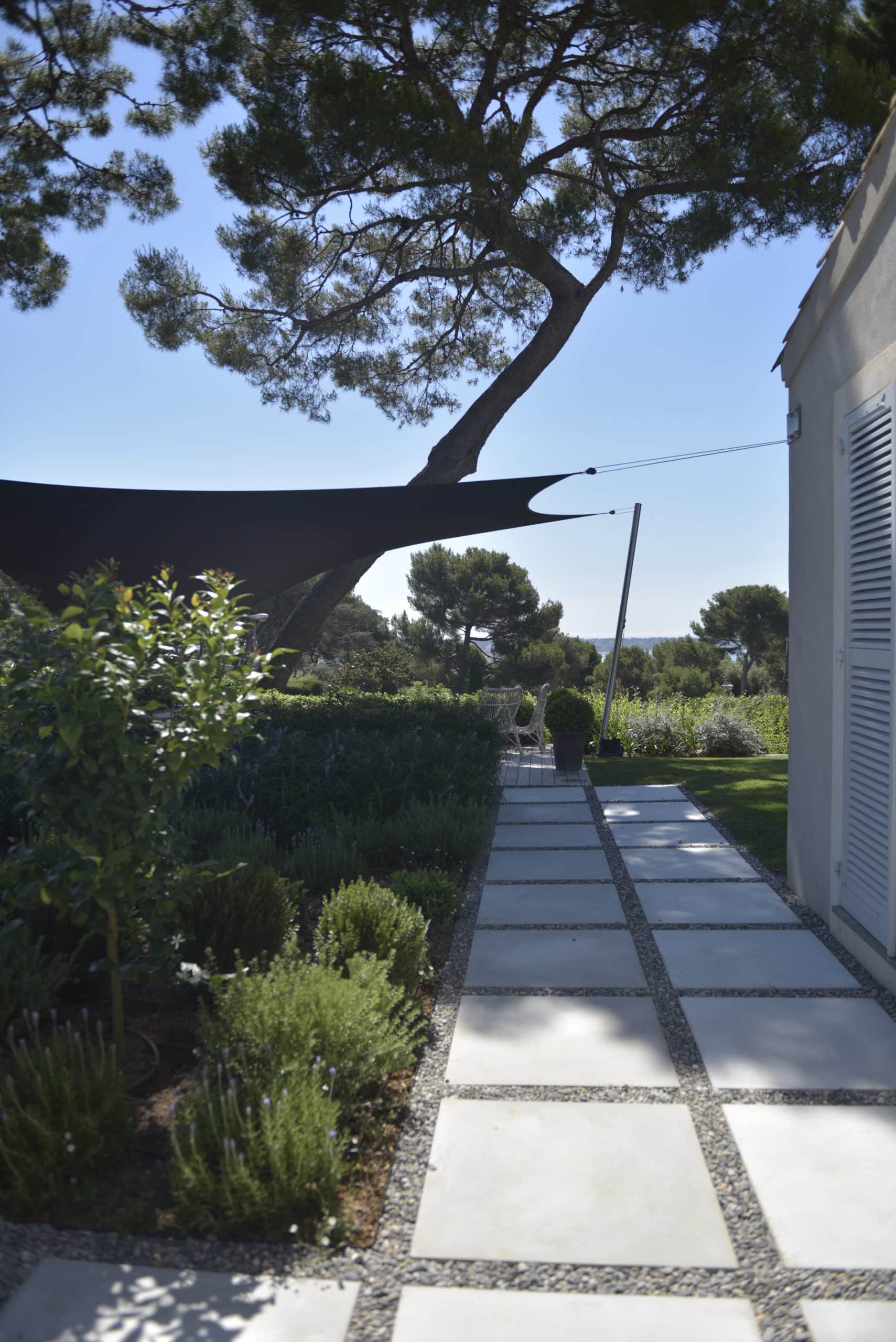 Integration of the villa into a haven of Mediterranean peace by creating several living and relaxation areas around the house. Trees were added to complement the existing cedar and provide shade and coolness.