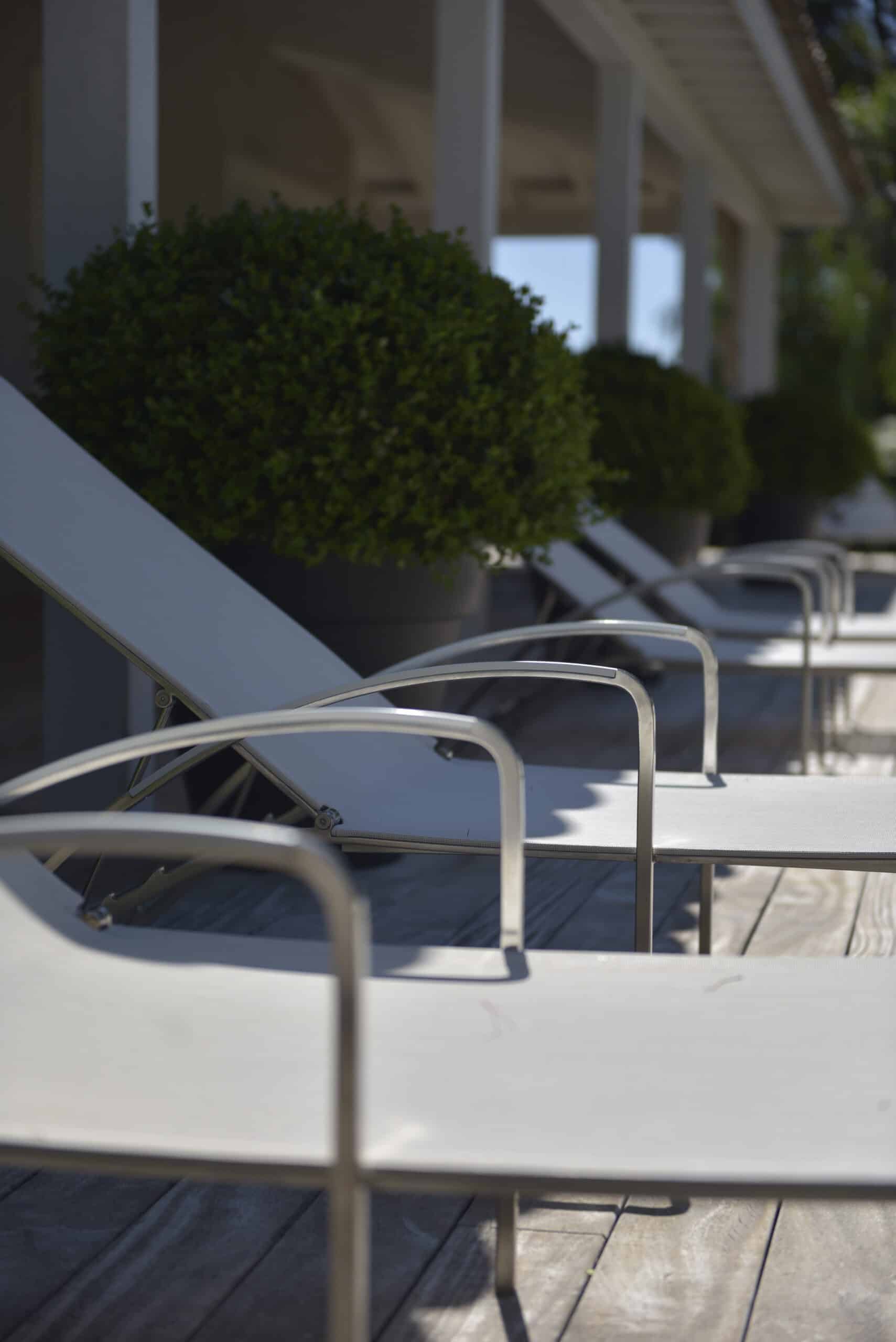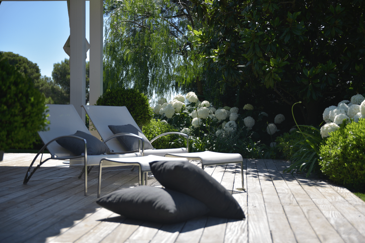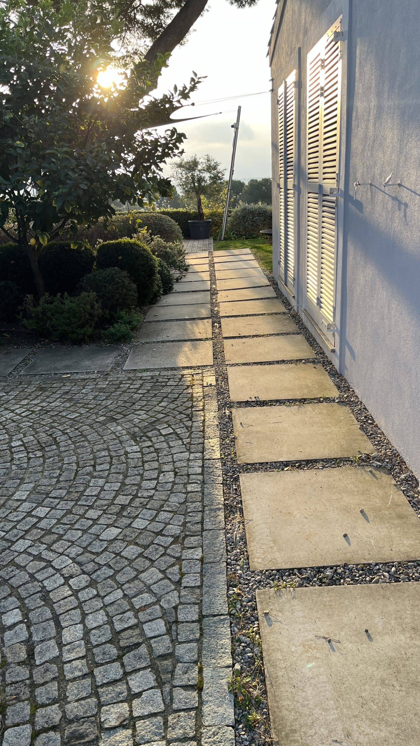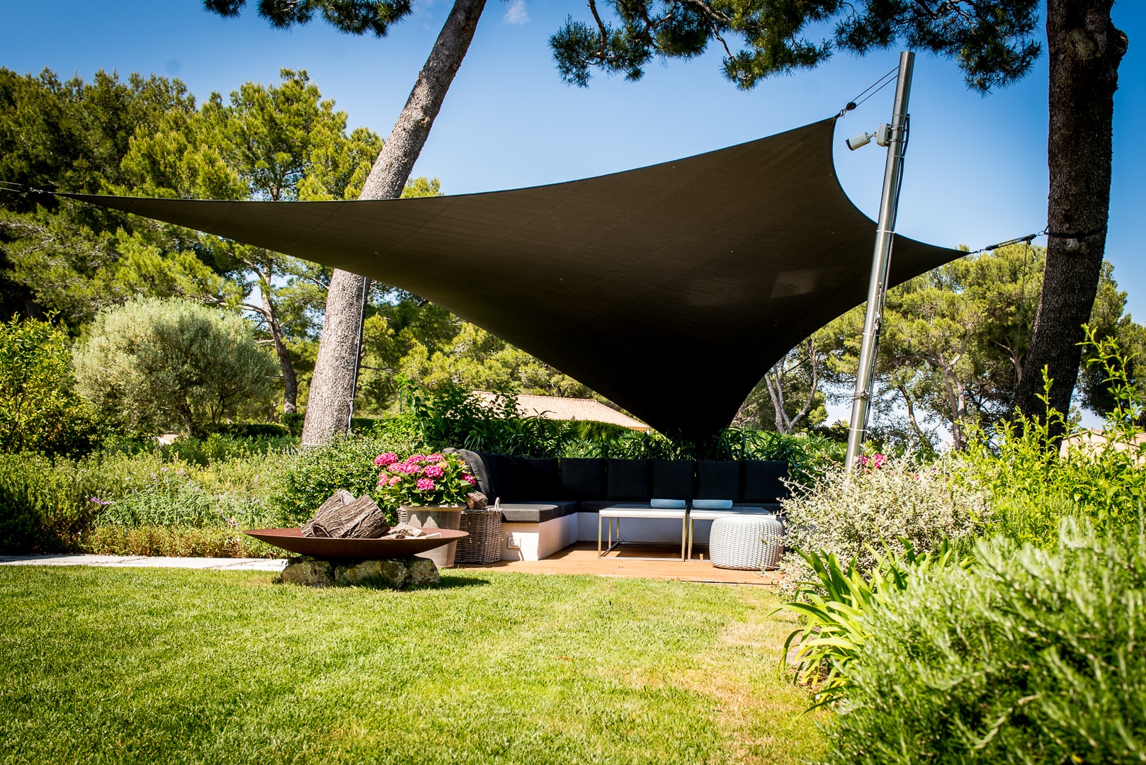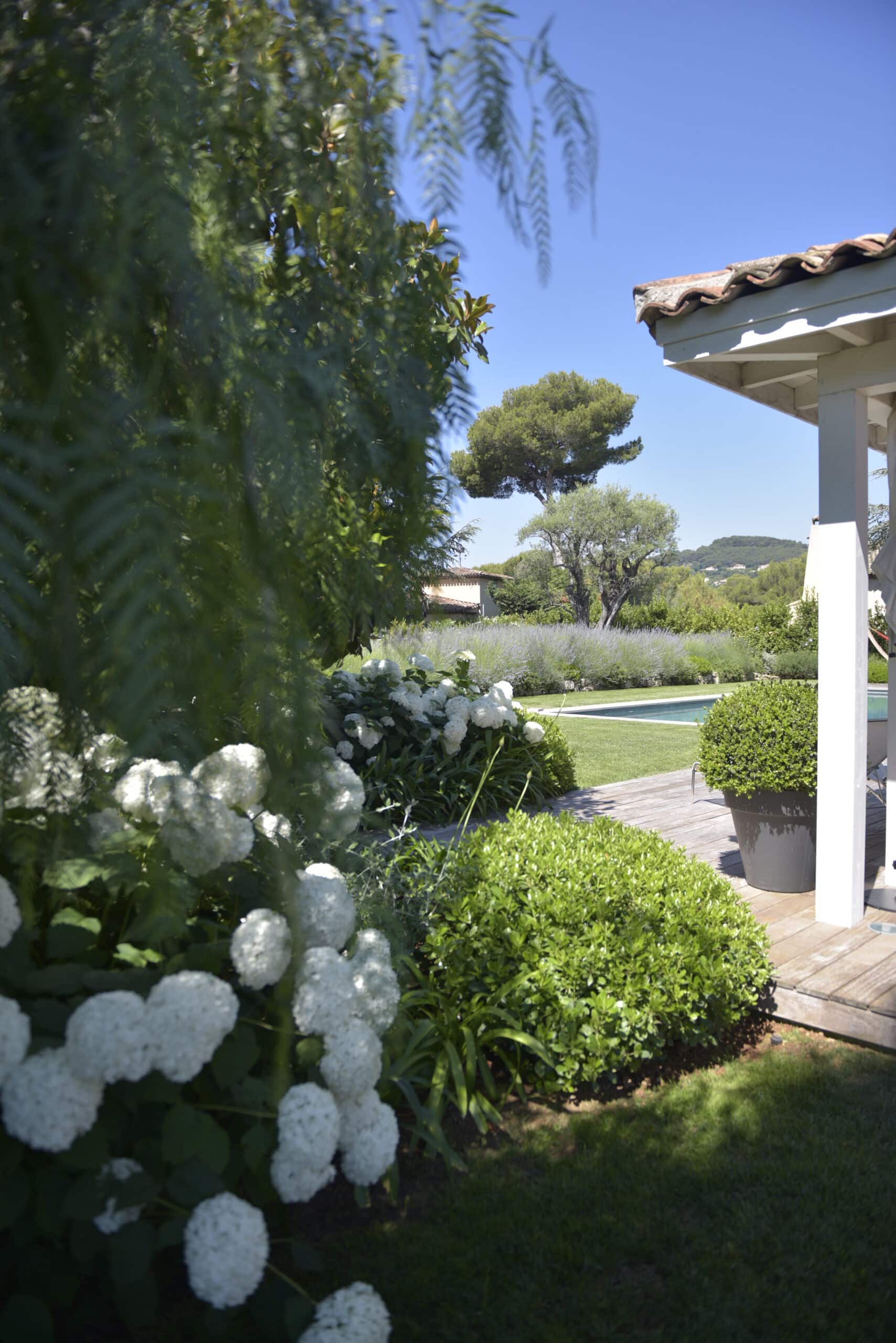 Integration of the villa into a haven of Mediterranean peace by creating several living and relaxation areas around the house. Trees were added to complement the existing cedar and provide shade and coolness.
