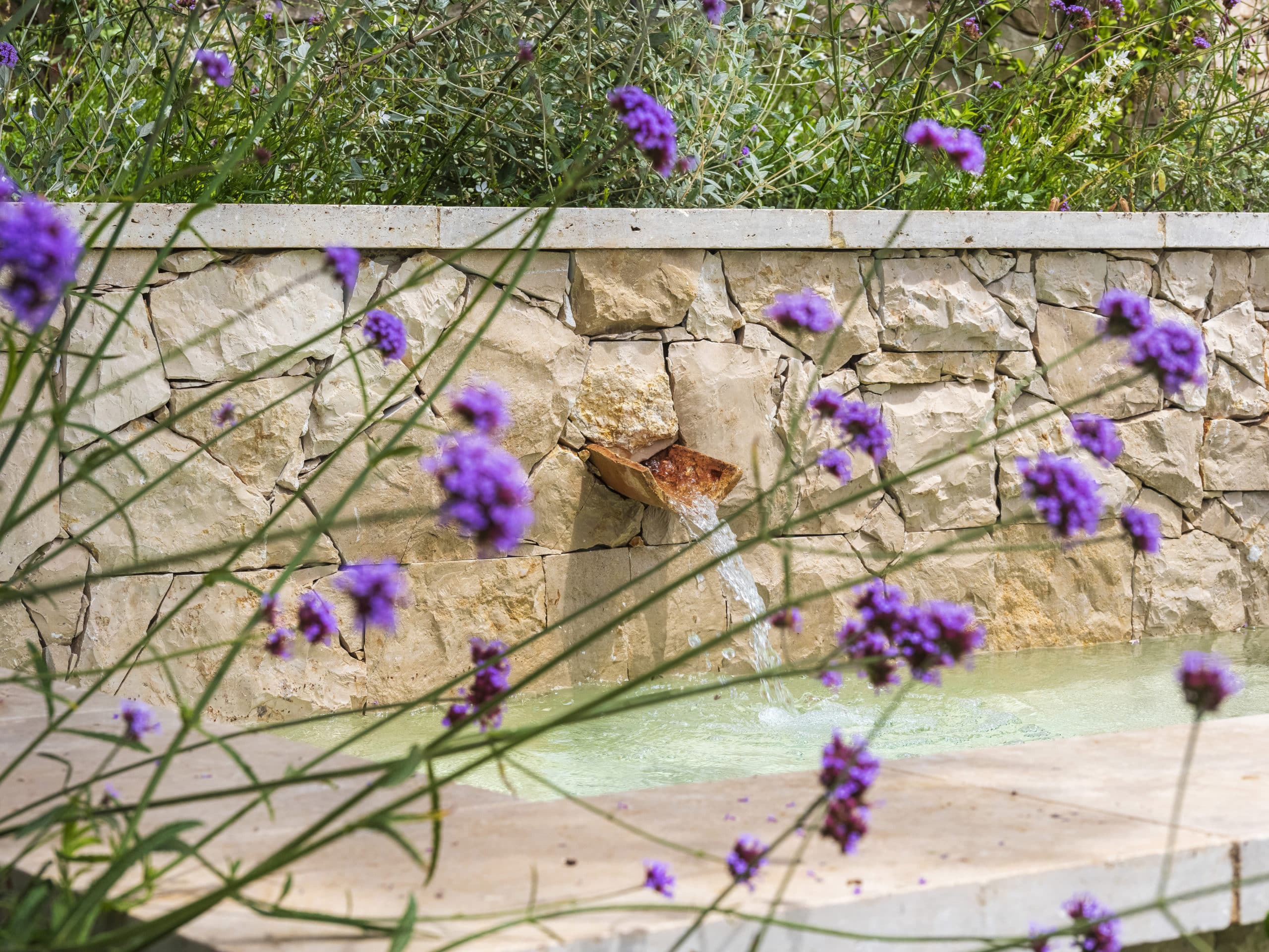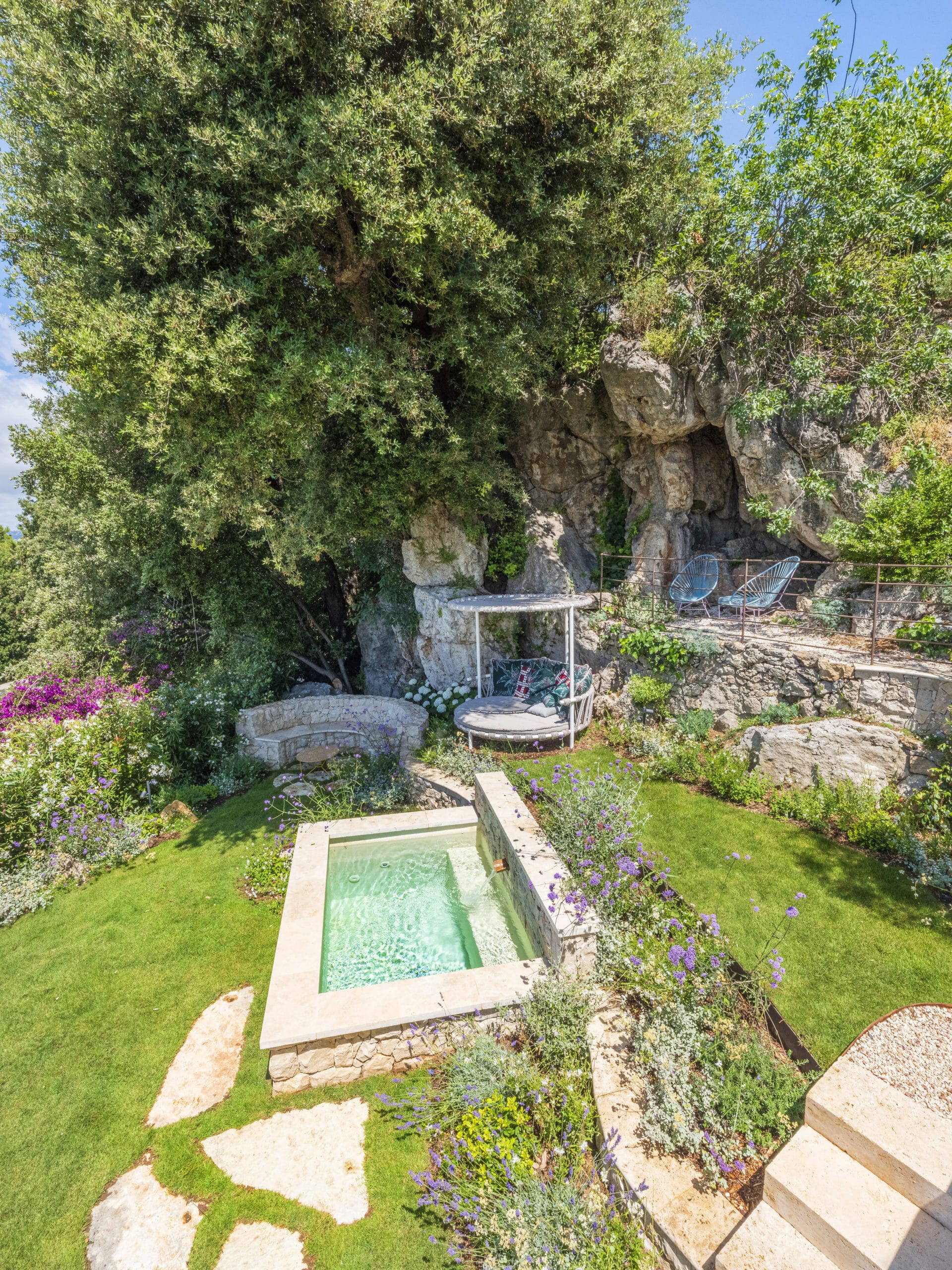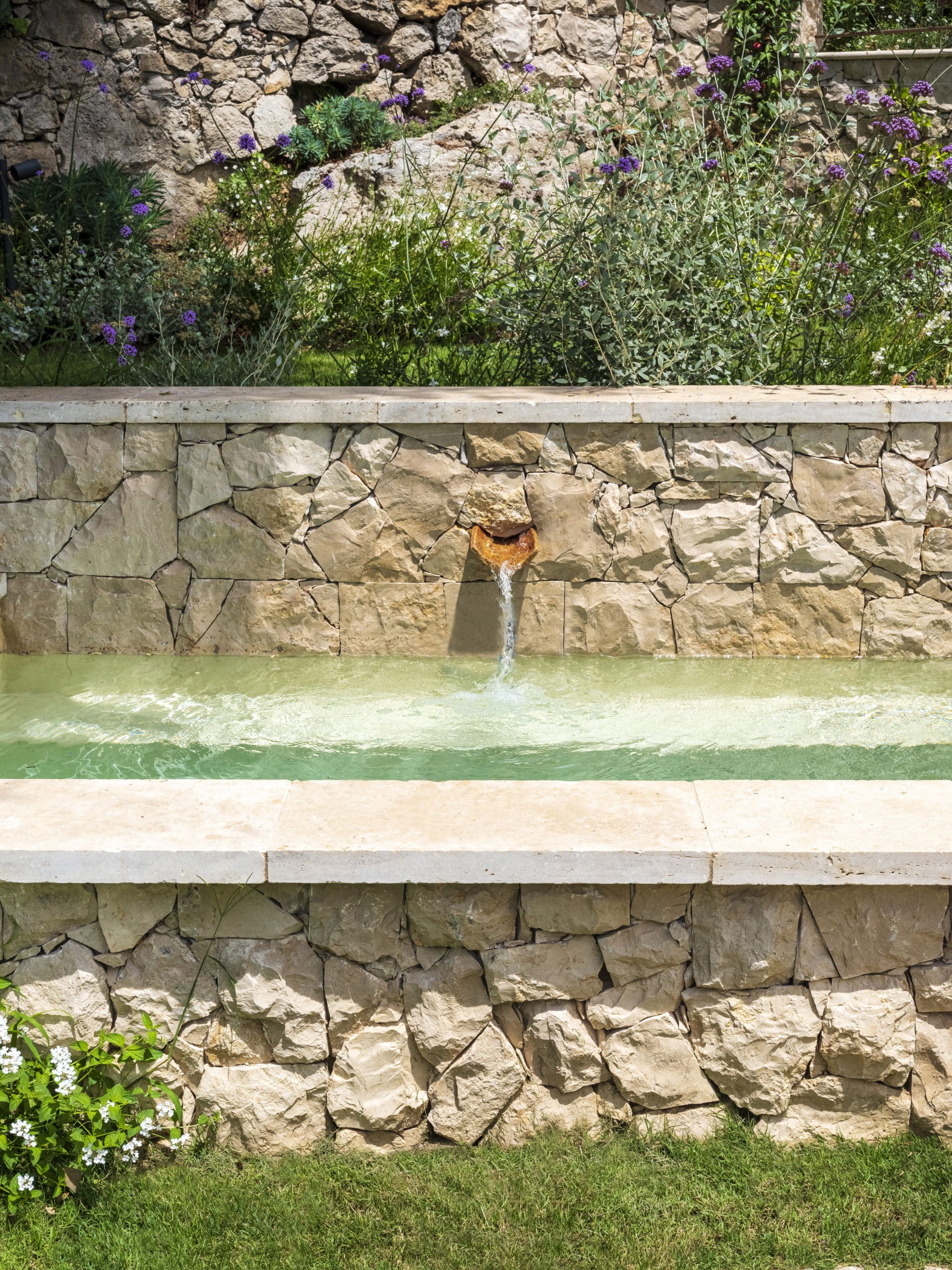 Ce projet d’aménagement paysager visait à redonner de l’intérêt à une partie inutilisée du jardin, en révélant son potentiel par la création d’un bassin semi-enterré en pierre, accompagné de muret en pierres et de végétaux méditerranéen. Nous avons donc choisi de renforcer le caractère ancien et authentique du lieu.