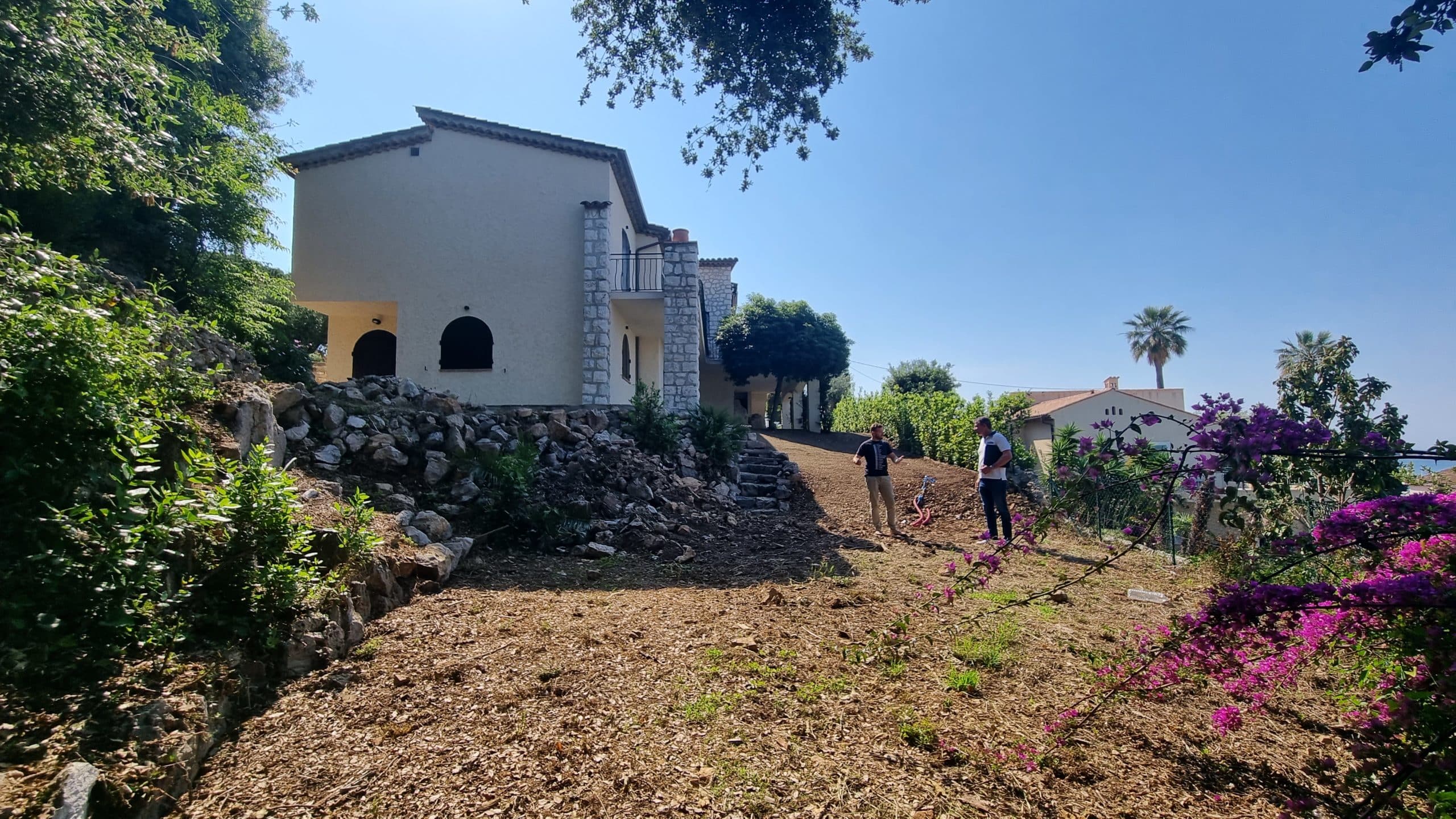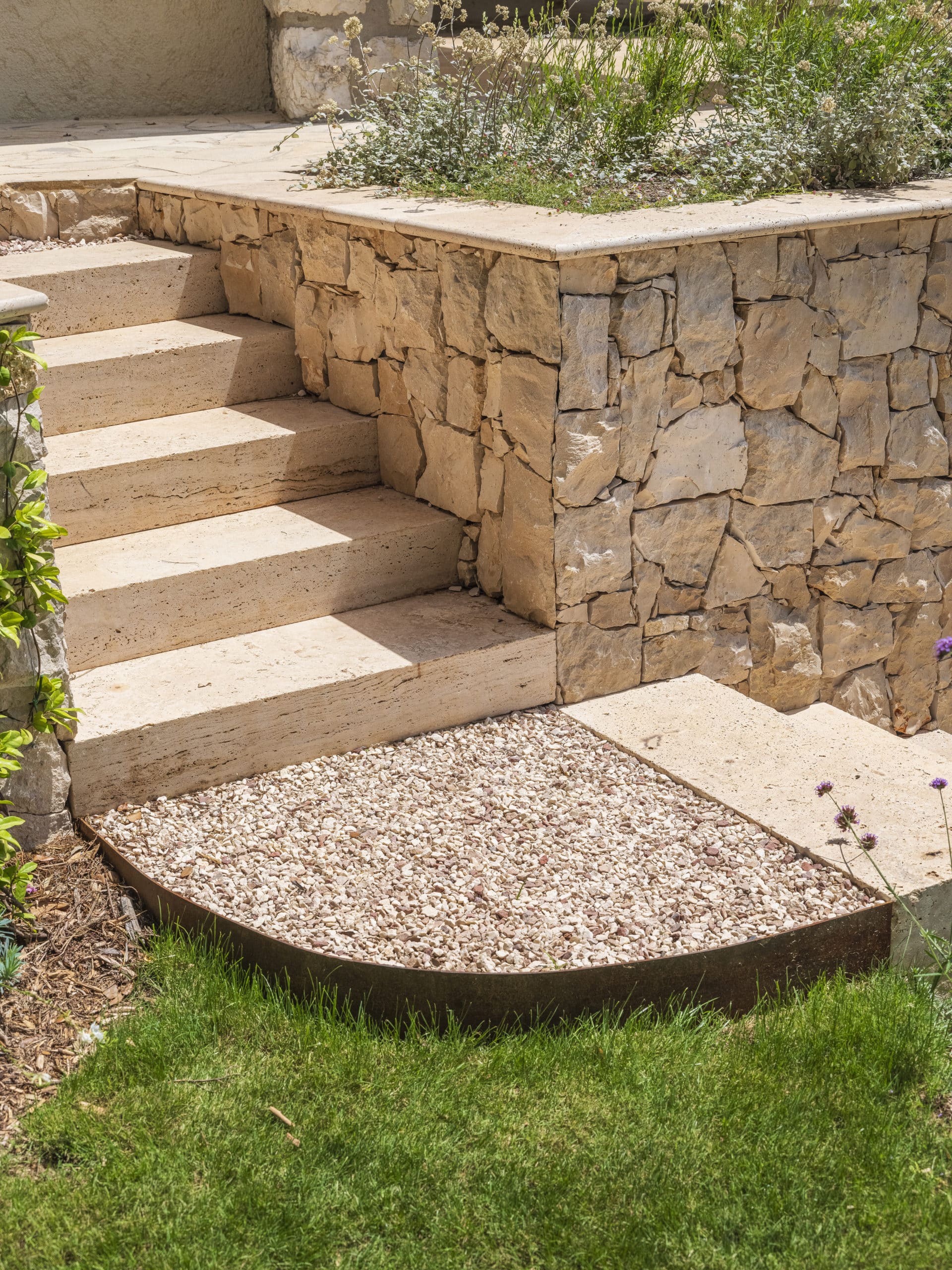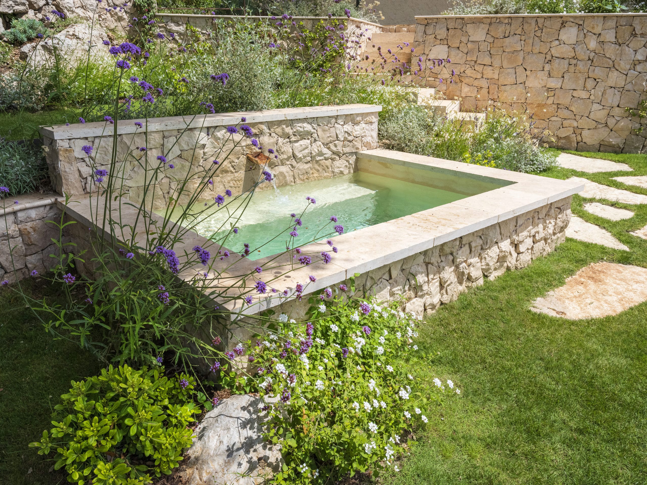 Ce projet d’aménagement paysager visait à redonner de l’intérêt à une partie inutilisée du jardin, en révélant son potentiel par la création d’un bassin semi-enterré en pierre, accompagné de muret en pierres et de végétaux méditerranéen. Nous avons donc choisi de renforcer le caractère ancien et authentique du lieu.